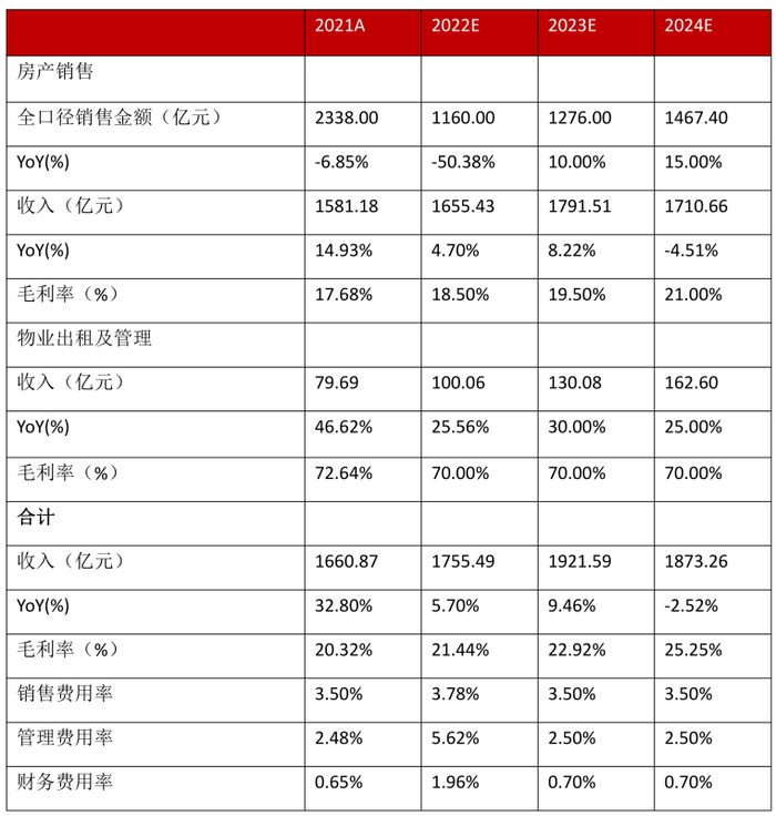(3)房产销售:由于房地产开发周期影响,房地产销售收入主要依赖于前期销售金额结转。毛利率方面,受前期高地价项目结转及限价政策影响,公司毛利率进入下行通道。但是公司在2019年察觉到行业变化就及时调整投资策略,量入为出。因此,我们预计2022-2024 年房产销售业务毛利率分别为18.5%、19.5%、21%。