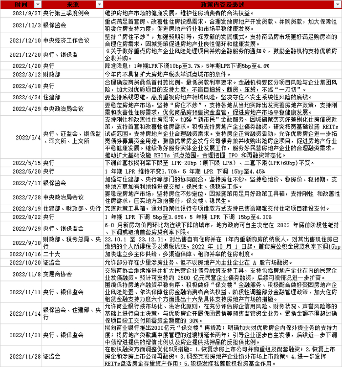 2021年9月之后,国家对房地产行业的态度就从之前的全面从严监管、防范系统性风险发生的可能性转向较为缓和的态度。在9月份提出金融机构应准确把握和执行好房地产金融审慎管理制度,避免一刀切;应维护房地产市场的健康发展,维护住房消费者的合法权益。在12月份提出支持金融机构重点满足首套房和改善性住房按揭贷款需求,并鼓励金融机构支持优质房企展开收并购业务。