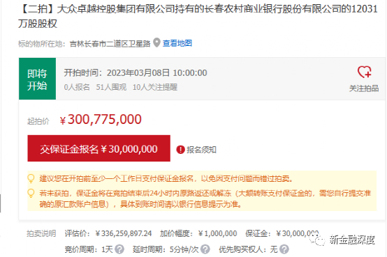 其中,大众卓越控股在长春农商行持有1.2亿股份,持股比例6.31%,是该行第六大股东。可以发现,该公司此番被拍卖的股份与总持股数额相等,即清仓拍卖。