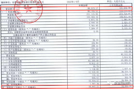 从长春农商行披露的最新财务状况来看,该行盈利水平依旧承压。2022年前三季度,该行实现营业收入8.86亿元,较2021年同期的12.12亿元降幅26.95%;净利润1.04亿元,同比上年的3.29亿元更是大降68.29%。