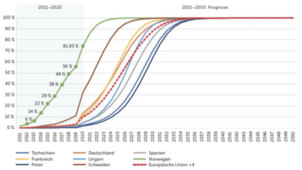 欧洲主要国家电动汽车渗透率规划,其中挪威和瑞典(绿色和红色)最为激进,欧洲汽车制造大国德国和法国(深橙色和浅橙色)则都将50%渗透率定在2025年。图源:Fraunhof