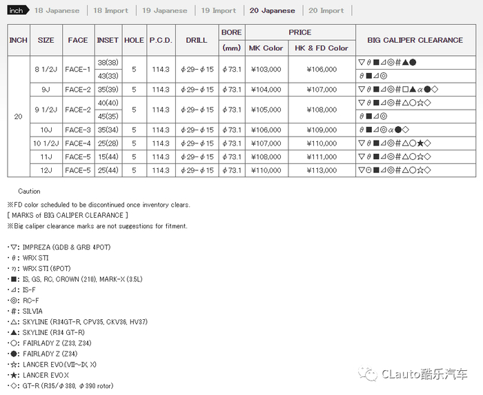 20寸的日系车数据,全系5*114.3,宽度从8.5J到12J,也全部给各类的STI、EVO、雷克萨斯RC-F\IS-F、GT-R、恶魔Z和各代EVO。