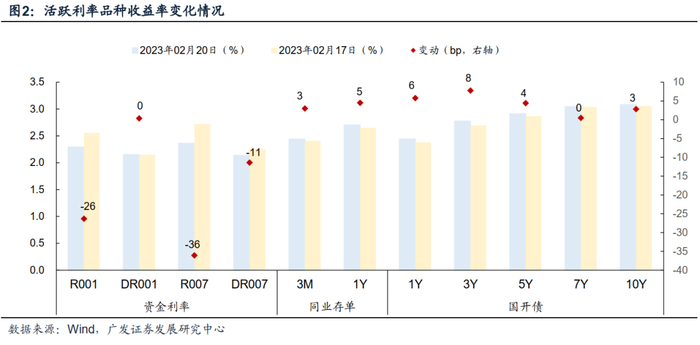 1. 市场回顾:今日央行开展2700亿7天逆回购操作,早盘隔夜资金面略紧,尾盘边际转松,DR001持平、DR007下行至2.14%。截至2月20日,10年国开活跃券(220220)收益率为3.0890%,较前一日上行3.2bp。