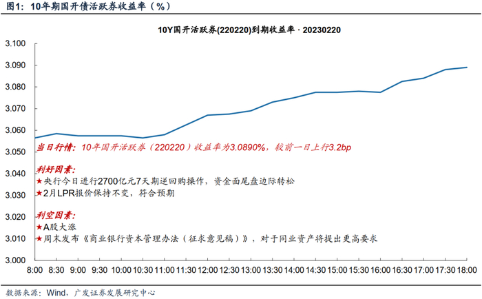 主要影响因素有:央行今日进行2700亿元7天期逆回购操作,尾盘资金面边际转松;2月LPR报价保持不变;A股大涨;周末发布《商业银行资本管理办法(征求意见稿)》,对于同业资产将提出更高要求。