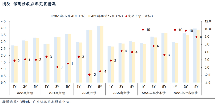 信用债收益率整体上行,收益率变动在-2至10bp之间,除3Y AA+城投债、3Y和5Y AA城投债外,其余品种收益率皆上行。其中二永债上行幅度较大,1Y AAA-二级资本债、1Y和3Y AAA-银行永续债上行10bp,3Y AAA-二级资本债、5Y AAA-银行永续债分别上行6bp、8bp。