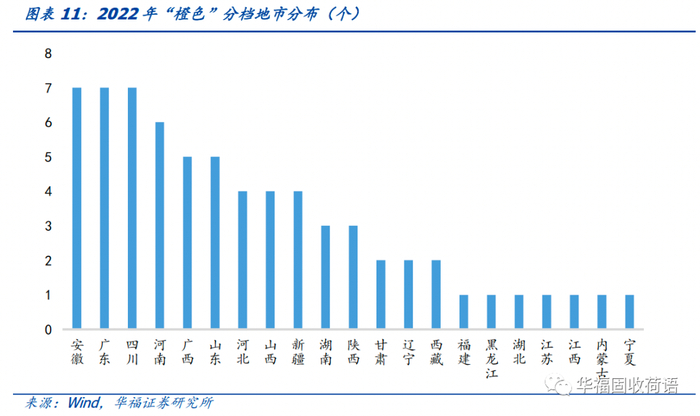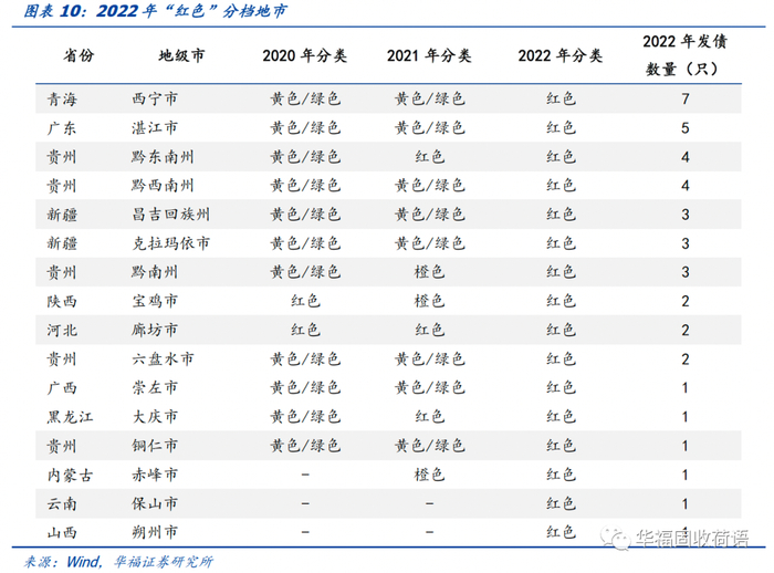 “红色”分档地市中有部分地市2022年发行的城投债数量较少,从而使得其颜色分档代表性比较弱,但西宁、湛江、黔东南州、黔西南州四市2022年发行了4-7只城投债,且均仅能借新还旧,我们倾向于认为此类区域的发债有所被限制。