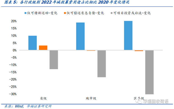 分行政级别来看,2021年和2022年这轮城投融资收紧对区县级城投平台的影响最大,使得区县级城投平台仅可借新还旧占比由2020年的16%提升到了2022年47%,直接提升了31个百分点;对应的,区县级平台可用于项目投资或补流的城投债占比也下滑了31个百分点。