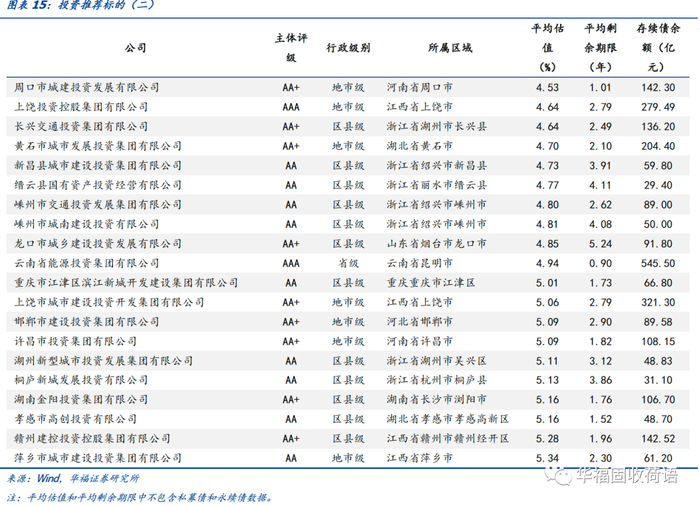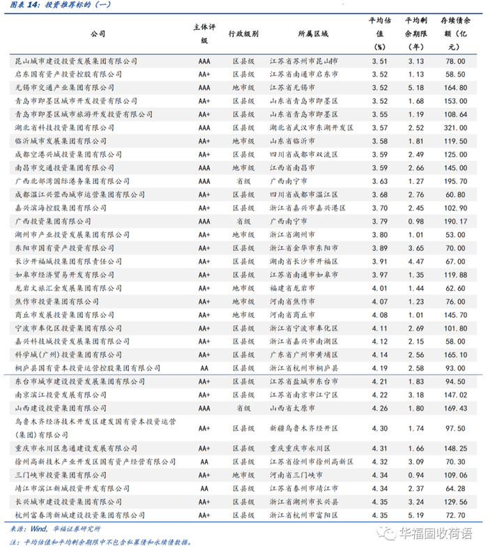 按照上述条件共筛选出了199个标的,其中当前存续债平均估值收益率在3.5%-4.5%的主体推荐关注湖北科技投资、无锡交通、山西建投、东台城建、成都空港兴城、宁波奉化投资等主体,存续债规模在50亿元以上,以AAA级和AA+级为主,主体资质尚可,可重点挖掘投资机会。