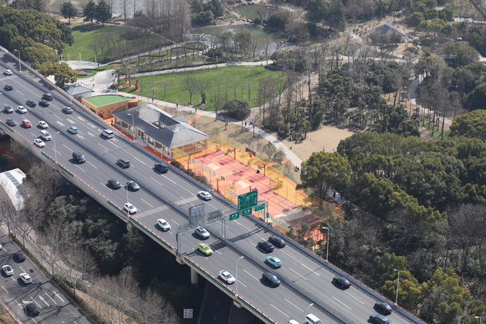从高空俯瞰,一边是绿树掩映,另一边是车水马龙,位于新虹桥中心花园北区的洛克公园以一抹亮色恰好地连接过渡。彩色的球场,运动的市民,为延安西路高架桥下空间增添了活力。洛克公园从2月上旬对外开放至今,2000平方米的运动空间俨然成为网红打卡新地标。