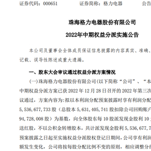 根据公告,格力电器2022年中期权益分派方案已获2022年12月28日召开的2022年第三次临时股东大会审议通过,方案内容为:拟以本利润分配预案披露时享有利润分配权的股本总额 55.37亿股(总股本56.31亿股扣除公司回购账户持有的股份9472.8万股)为基数,向全体股东每10股派发现金股利10元(含税),不送红股,不以公积金转增股本,共计派发现金股利55.37亿元。如在分配预案披露之日起至实施权益分派股权登记日期间,公司享有利润分配权的股本总额发生变化,公司将按每股分配比例不变的原则,相应调整分红总额。