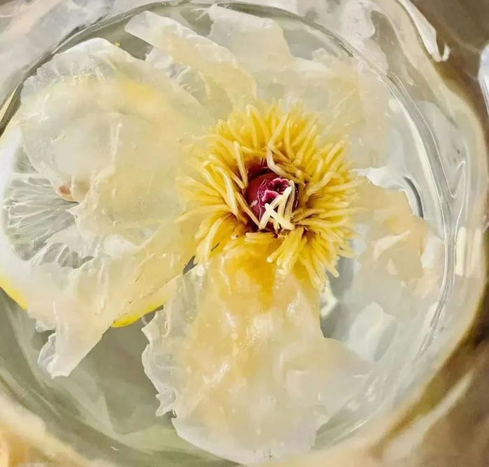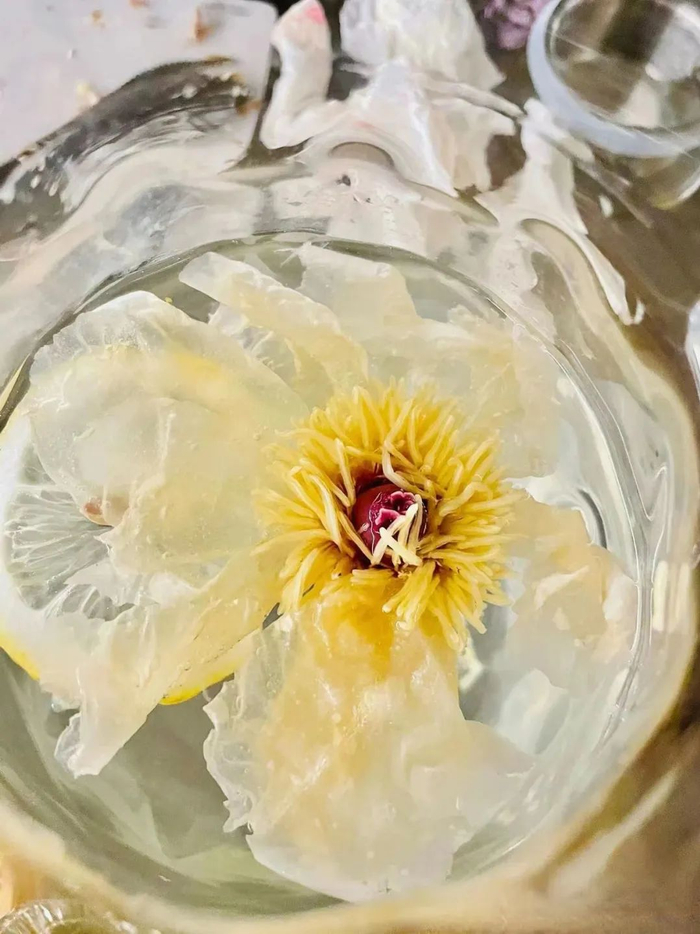 沸水冲泡约40秒左右即可食用,约3-5分钟,牡丹绽放,花型圆润饱满叶瓣层层叠叠,中心鹅黄的花蕊艳丽动人。