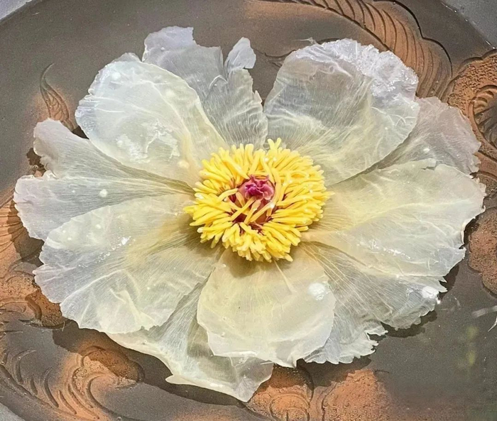 选晨露微开之牡丹采摘后,经过多道工序,保留下牡丹花的整朵形态,呈现在爱茶人的茶桌上。