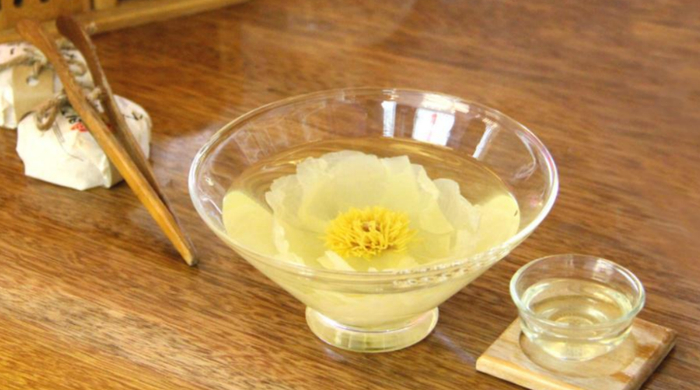 如能品一茗水中开放的洛阳牡丹,可以清晰的看到,白色的花瓣,深黄的花蕊,花瓣摇曳在淡黄花粉水中,冰清玉洁。