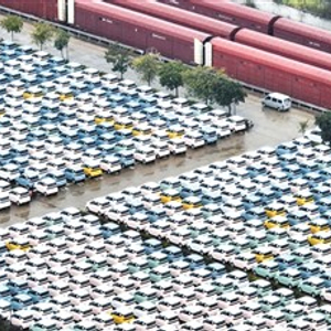 广西壮族自治区柳州市持续加快汽车产业由传统燃油车向新能源汽车转换的步伐,去年柳州新能源汽车产量突破170万辆,约占全国1/10。图为近日在柳州汽车城雒容汽车物流基地,柳州生产的新能源汽车通过火车发运销售。黎寒池摄(人民视觉)