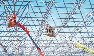日前在浙江省金华市金义新区的新能源汽车零配件产业园项目施工现场,工人们搭建厂房的网架。据悉,金义新区抢抓长三角一体化发展的战略机遇,着眼新能源汽车等项目落地新区,打造长三角具有引领示范效应的新能源产业链。朱 翚摄(人民视觉)