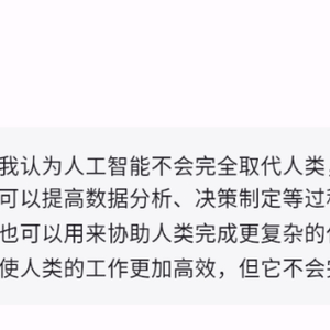 MOSS回答:“我认为人工智能不会完全取代人类,而是在一定程度上帮助人们完成工作。例如,机器可以提高数据分析、决策制定等过程中的效率,并可以节省大量时间和精力。此外,AI也可以用来协助人类完成更复杂的任务,比如诊断疾病、开发新产品等。总之,AI可以使人类的工作更加高效,但它不会完全取代人类。”