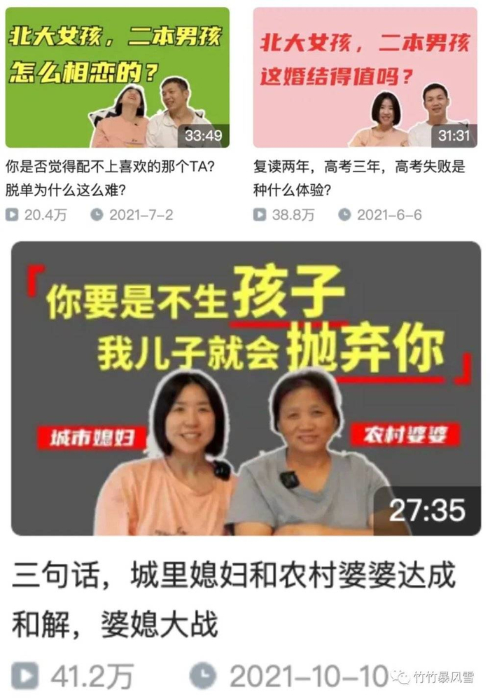 看她往期的视频,可以发现她很会、也很勇于给人贴标签,比如“北大女孩”和“二本老公”、“城里媳妇”对谈“农村婆婆”,她可以敏锐地找到相应的标签,干脆利落地贴在自己最亲近的人身上,并把他们推入大众的视野,接受互联网上的所有评判。
