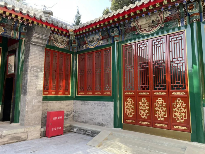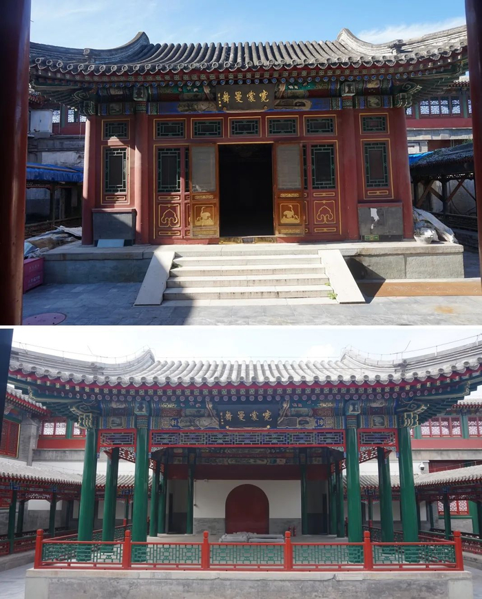 漪澜堂曾被仿膳饭庄占用近60年。在此过程中,由于多次功能性调整改造,对古建筑本体也造成了一定的影响。比如建筑群东侧的“霓裳曼舞”,这里曾是一座戏台,按照历史档案记载,建筑本身是三面敞开、一面有墙的开放状态,但仿膳饭庄在占用期间对戏台内部空间也进行了改造。此次修缮过程中,对这些非文物建筑都进行了拆除,在按照历史档案记载及调阅“样式雷”烫样的基础上,复建173.8平方米,从而恢复古建的原始形态。