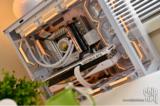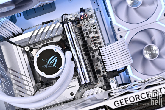 为了搭配浅色桌面,参赛选手特意选择了令自己心动的华硕ROG MAXIMUS Z790 APEX主板。其不仅颜值出众,更是拥有极为强大的超频性能,一经发布便创造多项超频纪录,不断自我超越,将13代酷睿i9-13900K处理器超频至9008.82MHz,离超10G全人类感谢又近了一步!外观采用浅银白装甲+浅色PCB,大面积散热片采用交错堆砌形式,以呈现APEX主板标志性的“X”造型,芯片组散热片斜切截面还有别具一格的ROG LOGO字样,尽显信仰之力!