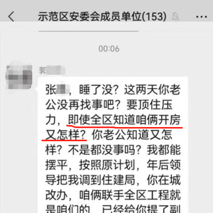 近日,一张疑似微信群聊天截图引发关注,截图中显示,该群名叫“示范区安委会成员单位”,聊天内容发布于00:06分,未显示发布日期,聊天发布者叫郭某某,聊天的文字内容发给张某,其中称,“要顶住压力,即使全区知道咱俩开房又怎样?不是都没事吗?我都能摆平,按照原计划,年后领导把我调到住建局,你在城改办,咱俩联手全区工程就是咱们的,已经给你提了副科了,我正科,将来咱俩还要提副县呢。”此后还有一句不雅信息。