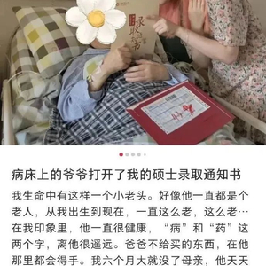 照片里,她粉色的长发像樱花一样泻下,趴在爷爷的病榻前,展示自己硕士录取通知书的照片。