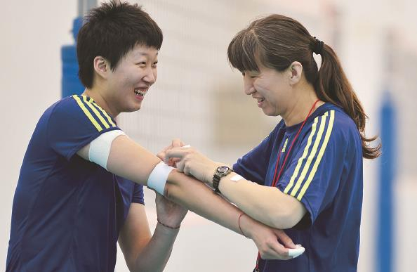 2012年,时任中国女排教练的赖亚文(右)帮队员范琳琳绑绷带 图 新华社