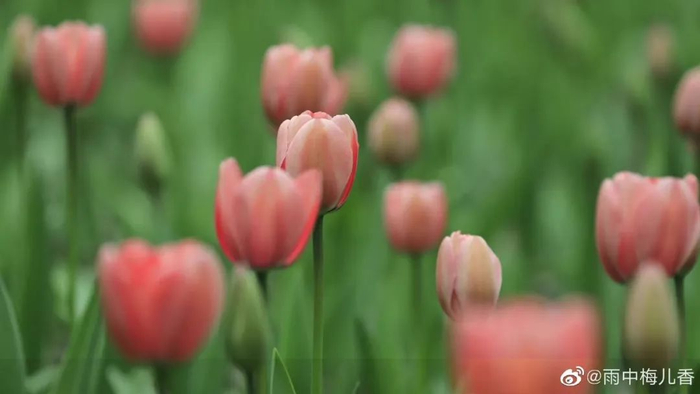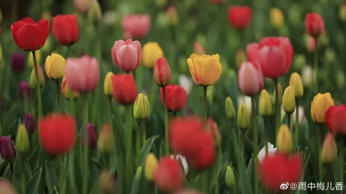 粉色、红色、橘色、紫色、白色… 郁金香已经在寒风中绽放,时而随风摇曳,时而争奇斗艳,偶尔飞来一只小蜜蜂,让人感受到了春天的勃勃生机。