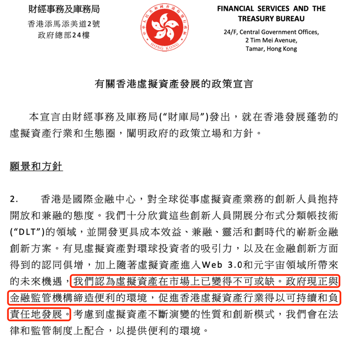 2022年10月,香港在发表的《有关虚拟资产在港发展的政策宣言》中提到,香港是国际金融中心,对全球从事虚拟资产业务的创新人员抱持开放和兼融的态度。香港政府正与金融监管机构缔造便利的环境,以促进香港虚拟资产行业得以可持续和负责任地发展。