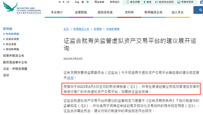 2月20日晚间,香港证监会就有关监管虚拟资产交易平台的建议展开咨询(公开征求意见),根据将于6月1日生效的新发牌制度,所有在香港经营业务或向香港投资者积极进行推广的中央虚拟资产交易平台,需获证监会发牌。为符合新规要求,拟订立为期12个月的过渡期。