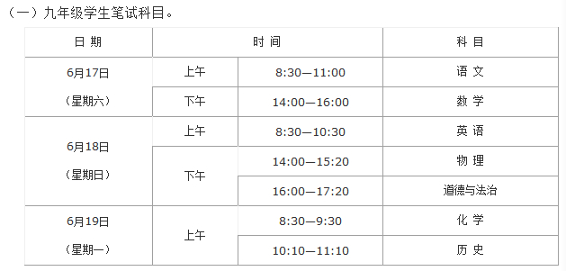 九年级学生考试笔试科目:语文、数学、英语、物理、道德与法治、化学、历史,共7科7卷。其中,道德与法治实行开卷笔试,其他科目均为闭卷笔试。笔试科目的语文科目为一卷制,其他科目为两卷制。各科目试卷满分值及考试时长分别为: 语文120分,考试时长150分钟;数学120分,考试时长120分钟;英语120分(其中听力30分),考试时长120分钟;物理80分,考试时长80分钟;道德与法治80分,考试时长80分钟;化学60分,考试时长60分钟;历史60分,考试时长60分钟。