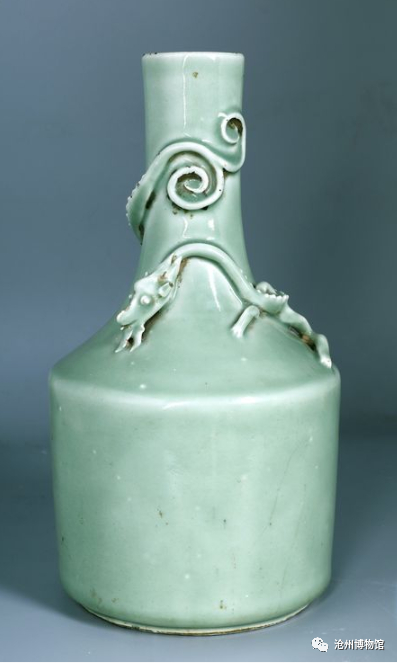 长颈,斜折肩,直腹,平底。该瓶通体施豆青釉,瓶颈和肩部堆塑一条尾上头下的盘龙,造型独特,釉色莹润。