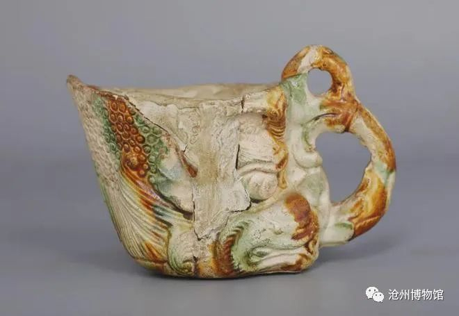 这件三彩杯1988 年出土于沧县前营村,内外皆施三彩釉,外部以白色为底,间施赭黄、绿颜色,杯口前端上翘,平底。杯身浮雕出龙首造型,怒目圆睁,张口作吐水状,水柱上卷形成杯柄,巧妙与杯口相连。
