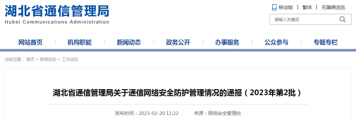 湖北省通信管理局关于通信网络安全防护管理情况的通报(2023年第2批)