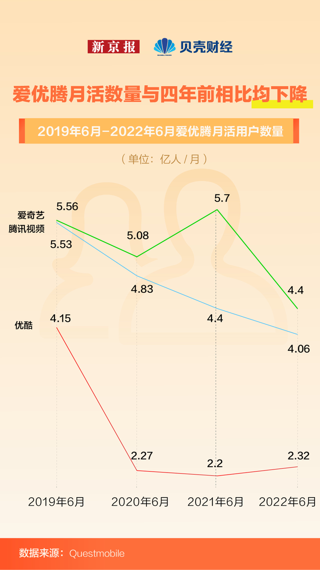 与此同时,长视频平台还面临短视频的冲击,其月活跃用户还遭受短视频平台的蚕食和攫取。其会员涨价策略也会使得一部分付费意愿较低的用户流失。贝壳财经记者梳理QuestMobile数据发现,爱优腾2022年6月月活跃用户数量与2019年同期相比,均显著下降。