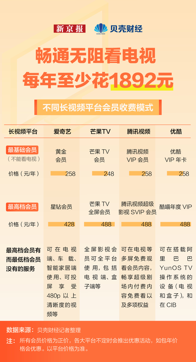 贝壳财经记者梳理主流长视频平台会员收费模式发现,这些长视频平台上的基础版会员,基本都不支持在电视端播放。如果想要畅通无阻在电视上观看所有节目,每年最少需要花费1892元购买主流长视频平台上的最高配置的会员,其中还不包括有线电视费、宽带费以及部分应版权方要求的付费电影等。