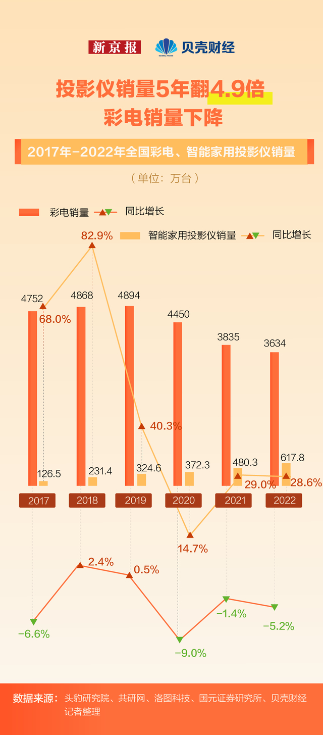 智能电视卖不动了。与此同时,智能投影仪市场却进入增长快车道,2017年,全国智能家用投影仪销量为126.5万台,而2022年销量暴涨至617.8万台,5年来翻了4.9倍。
