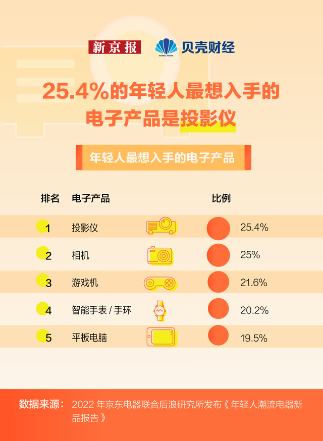 随着科技的进步和消费需求的升级,越来越多的年轻人选择放弃电视,转而购买投影仪。据2022年京东电器联合后浪研究所发布《年轻人潮流电器新品报告》显示,在当代年轻人当中呼声最高的“新三大件”分别为扫地机器人、投影仪、折叠屏手机。其中,投影仪是年轻人最想入手的电子产品。
