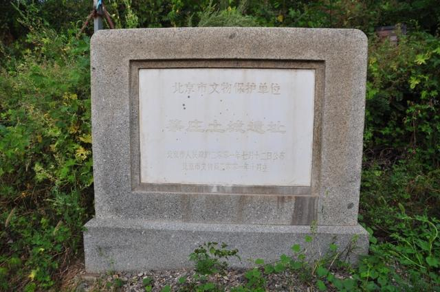 东南角下立有北京市文物保护单位碑牌:蔡庄土城遗址,2001年7月12日公布,2001年10月立。墙外空地的铁笼里跳动着鸽子,鹿与牛在圈里平静地吃草,给沉寂的古城带来了生机。站在文保碑处西望,是条小路。我沿着小路西行,观望城内,满目果树,有桃树、红果树、柿子树、樱桃树等。土地经过耕耘,寻找不到陶瓦碎片。行走间看到一大坑,是砖窑遗址。南墙仅存几十米长,约四五米高,连到城堡的西南角。墙体已被雨水冲刷流失严重。个别部位偶能看到夯层,每层并不清晰,约有10厘米左右。墙上有几处孔洞,夯筑时放上木棍等物体,以结实城墙。墙下有铁板保护,防止黄土流到路上妨碍行走。沿墙根新栽了一排白杨树。西墙已无,只能从较高的地势看出是城墙基址,上面新砌了砖墙。300多米见方的城堡被围了起来,形成封闭空间。