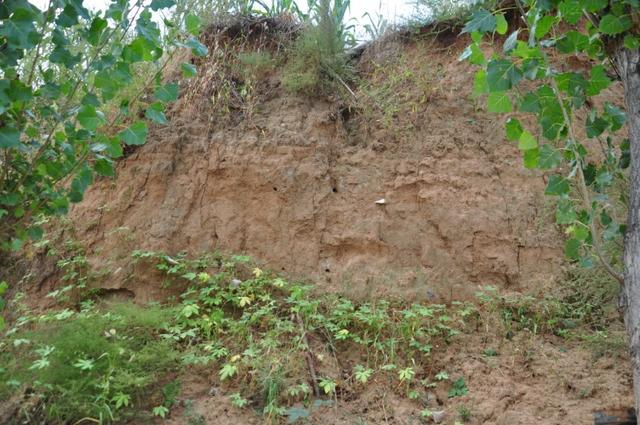 过河上了小山丘,土城边立有巨石,上书红字:土城山。这才意识到小山丘因城堡也有了称谓。向前看到了高高的黄土夯墙,这是城堡的东南角,墙面长满了荒草灌木,枝叶茂盛,很难看到墙体。东城墙低矮如土垄,墙体很宽,平整出几级阶状,上边种着不同的蔬菜,长势良好。墙基上有水管穿过,向墙内送水,墙里面有果树林。