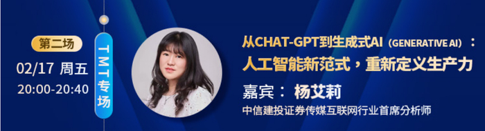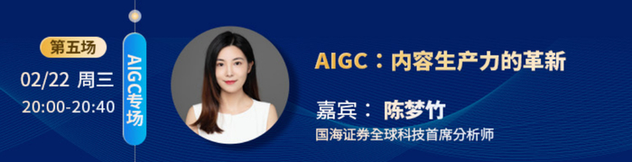 那么针对大家所关心的AIGC目前的发展阶段及未来趋势,AIGC的技术原理拆解以及技术规模商用时间表,AIGC的成本投入、商业模式与价值空间测算,AIGC相关产业链及投资机会等热门话题。我们特邀国海证券全球科技首席分析师陈梦竹老师就以上几方面内容,为大家带来全面、专业的分享~