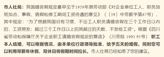 对此,成都市人社局回复称,根据相关规定,职工本人结婚,可以根据情况,由本单位行政领导批准,给予五天的婚假。同时可以利用带薪年休假、双休日将假期时间拉长。