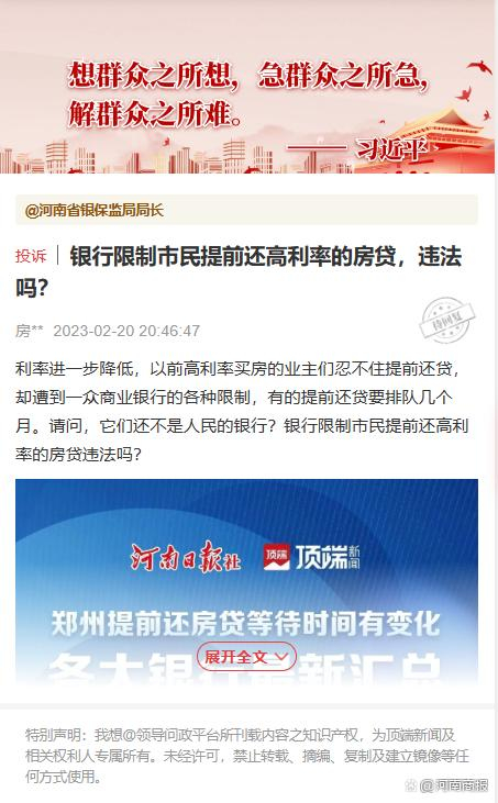 郑州市民留言质问提前还贷,却遭商业银行各种限制