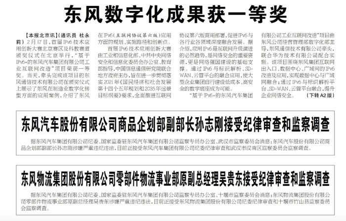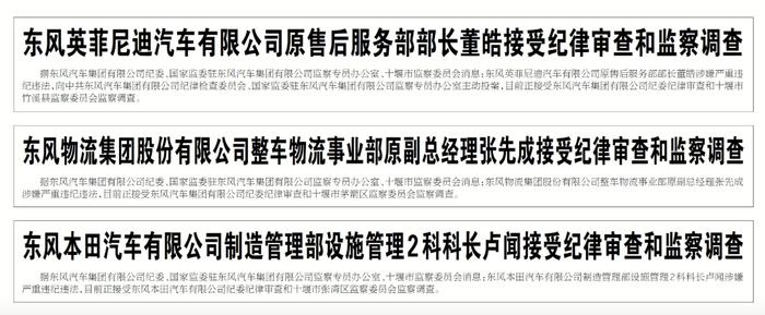 据《东风汽车报》(国家新闻出版总署批准的面向全国公开发行的汽车行业媒体,由东风汽车公司主办)21日刊登,东风汽车股份有限公司商品企划部副部长孙志刚涉嫌严重违纪违法,目前正接受东风汽车集团有限公司纪委纪律审查和武汉市汉南区监察委员会监察调查;东风物流集团股份有限公司零部件物流事业部原副总经理吴贵东涉嫌严重违纪违法,目前正接受东风物流集团股份有限公司纪委纪律审查和十堰市竹山县监察委员会监察调查;