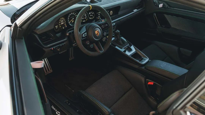 内饰方面,保时捷992 911 GT3 RS Carrera RS也以黑色为主,搭配了绿色缝线、碳纤维装饰的真皮内饰,部分细节上都有RS的logo,座椅头枕上还有赛道刺绣和WEISSACHRS字母刺绣。