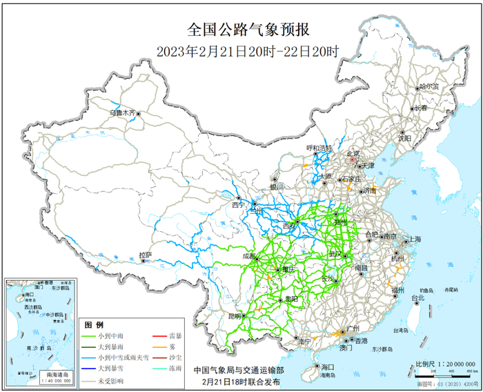 2月21日20时至22日20时,新疆沿天山地区、内蒙古中部、黑龙江西北部、西藏北部和东部、青海东部和南部、甘肃南部、宁夏南部、陕西中部、山西北部、河北北部、川西高原等地的部分地区有小到中雪或雨夹雪,其中,西藏东部等地的部分地区有大雪。西藏东南部、黄淮西部、江淮西部、江汉大部、江南西部、西南地区大部、广西西北部等地的部分地区有小到中雨,局地有大雨。另外,河北南部、内蒙古西南部、山东北部、浙江南部、福建北部、广东中部、广西东南部、四川盆地南部、贵州西部、云南东北部等地局地有雾。