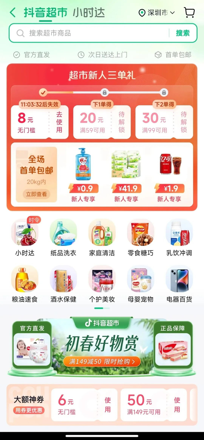 2022年10月,“抖音超市”在广州、深圳、惠州以及东莞四个城市试点,并和顺丰达成物流合作;2023年1月28日,抖音悄悄上线“抖音超市”功能。