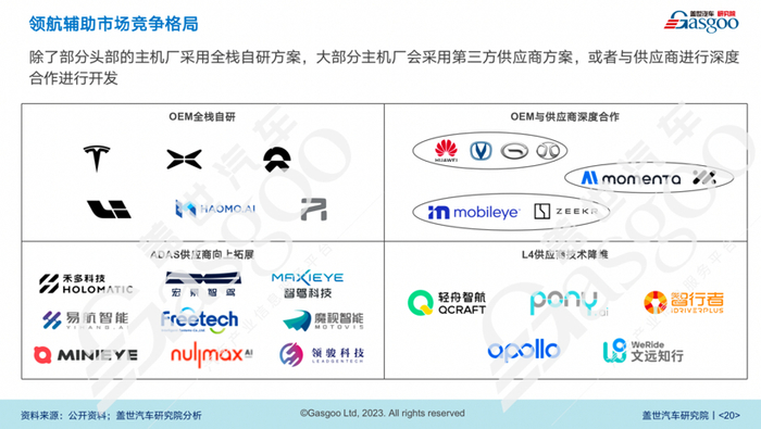 目前,领航辅助市场的竞争格局分为OEM全栈自研、OEM与供应商深度合作、ADAS供应商向上拓展和L4供应商技术降维四类。