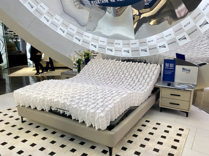 除去以上两个大牌“五花八门”的展示,另一床垫品牌漫波深睡(公司全称“成都力长床具有限公司”)的展览则比较“赛博朋克”。漫波深睡的看点在于其展示了内部的床垫弹簧架构。其弹簧共有5层,上下两个口径偏小,中间偏大。