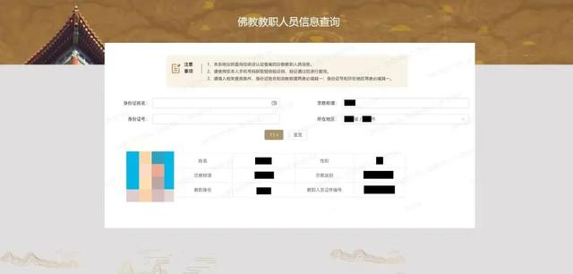 信息查询系统公布了宗教教职人员的身份证姓名、性别、照片、宗教称谓、宗教派别、教职身份及教职人员证件编号(仅展示部分数字)等7项信息。