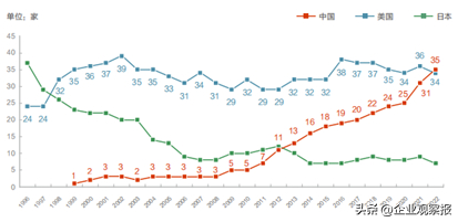 前100名:从无一入榜到35家。1999年,中国首次有1家企业进入世界100强;2013年,世界100强的中国企业数量超过日本,稳居第二;2022年,美国、中国的世界100强企业营业收入占比分别为37.7%、33.7%,合计超过70%。中国的世界100强企业数量超过美国,首次领跑全球,但是营业收入规模与美国仍有差距。